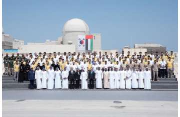 شهد الشيخ محمد بن زايد آل نهيان ولي عهد أبوظبي نائب القائد الأعلى للقوات المسلحة ومون جي إن رئيس جمهورية كوريا الجنوبية الصديقة الاحتفالية التي أقيمت بمناسبة اكتمال الأعمال الإنشائية للمحطة الأولى في مشروع محطات "براكة" للطاقة النووية