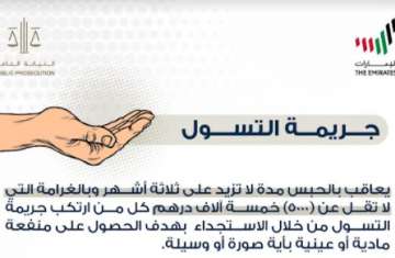 أوضحت النيابة العامة للإمارات، من خلال تغريدة نشرتها اليوم على حساباتها في مواقع التواصل الاجتماعي عقوبة التسول .