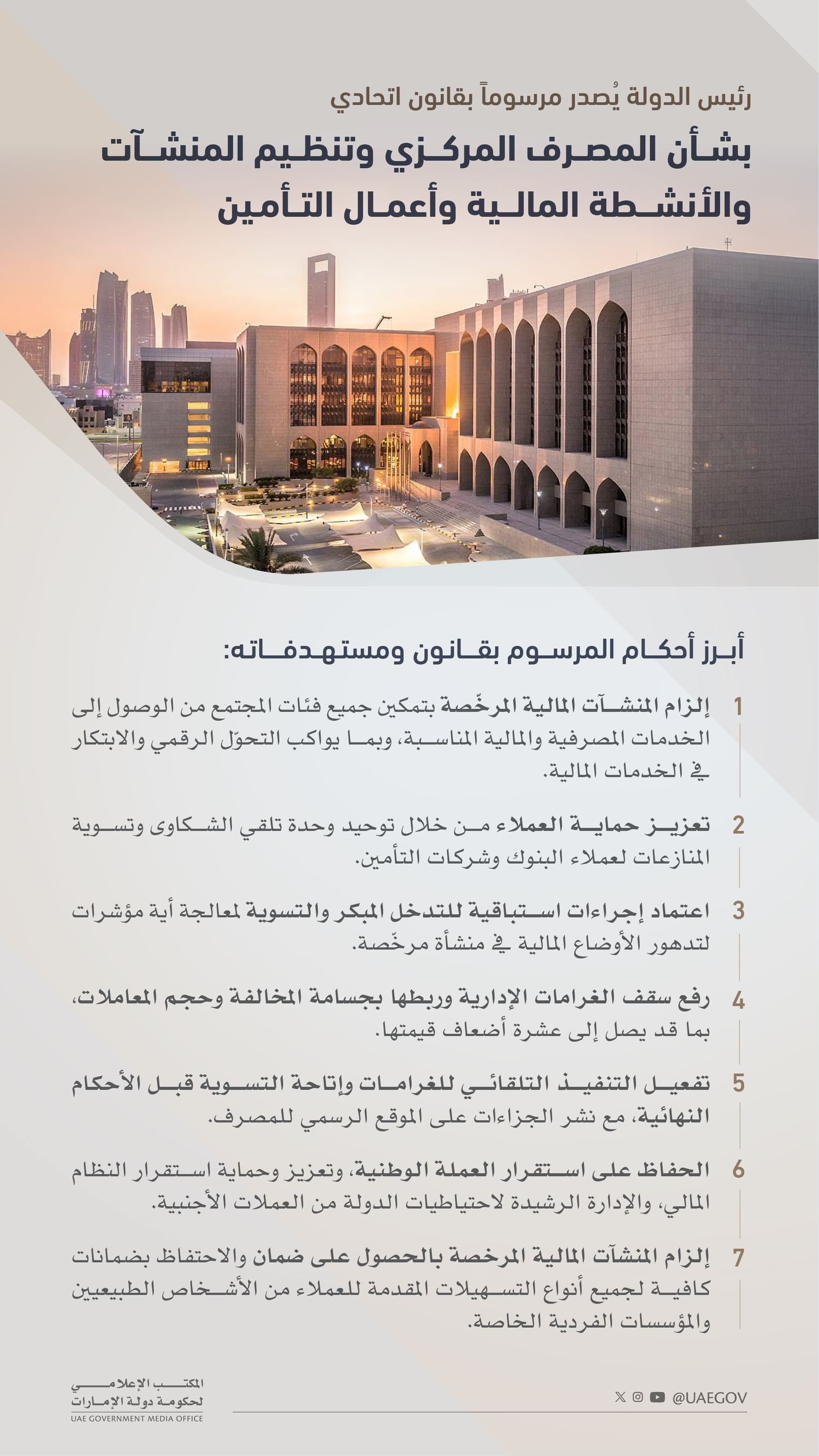 الحفاظ على استقرار العملة الوطنية، وتعزيز وحماية استقرار النظام المالي، والإدارة الرشيدة لاحتياطيات الدولة من العملات الأجنبية، أصدر صاحب السمو الشيخ محمد بن زايد آل نهيان، رئيس الإمارات، المرسوم بقانون اتحادي رقم (6) لسنة 2025 بشأن المصرف المركزي وتنظيم المنشآت والأنشطة المالية وأعمال التأمين.