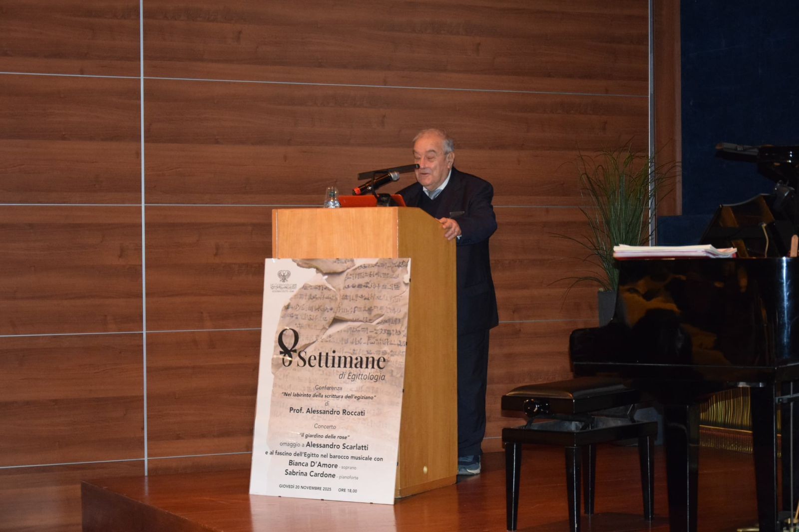 واستضافت الأكاديمية، ضمن مبادرتها ثمانية أسابيع حول الحضارة المصرية القديمة، البروفيسور أليساندرو روكاتي، أحد أبرز الأسماء في دراسات علم المصريات. وقد استهل روكاتي حديثه باستعادة ذكرياته عن أول مؤتمر قدّمه في الأكاديمية قبل أربعين عامًا، إبّان تولّي وزير الثقافة الأسبق الفنان فاروق حسني إدارة الأكاديمية، كما وجّه شكره لمديرة الأكاديمية على استضافته في الوقت الحالي. وبدأ محاضرته متحدثًا عن أهمية الكتابة في مصر، من الكتابة الديموطيقية وصولاً إلى الكتابة القبطية.