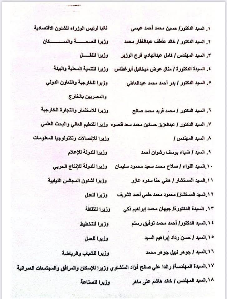 بعد موافقة مجلس النواب المصري، اليوم الثلاثاء، على التشكيل الوزاري الجديد برئاسة الدكتور مصطفى مدبولي، بعد التشاور مع رئيس الجمهورية عبد الفتاح السيسي، صباح اليوم، ننشر أسماء التشكيل كالتالي.