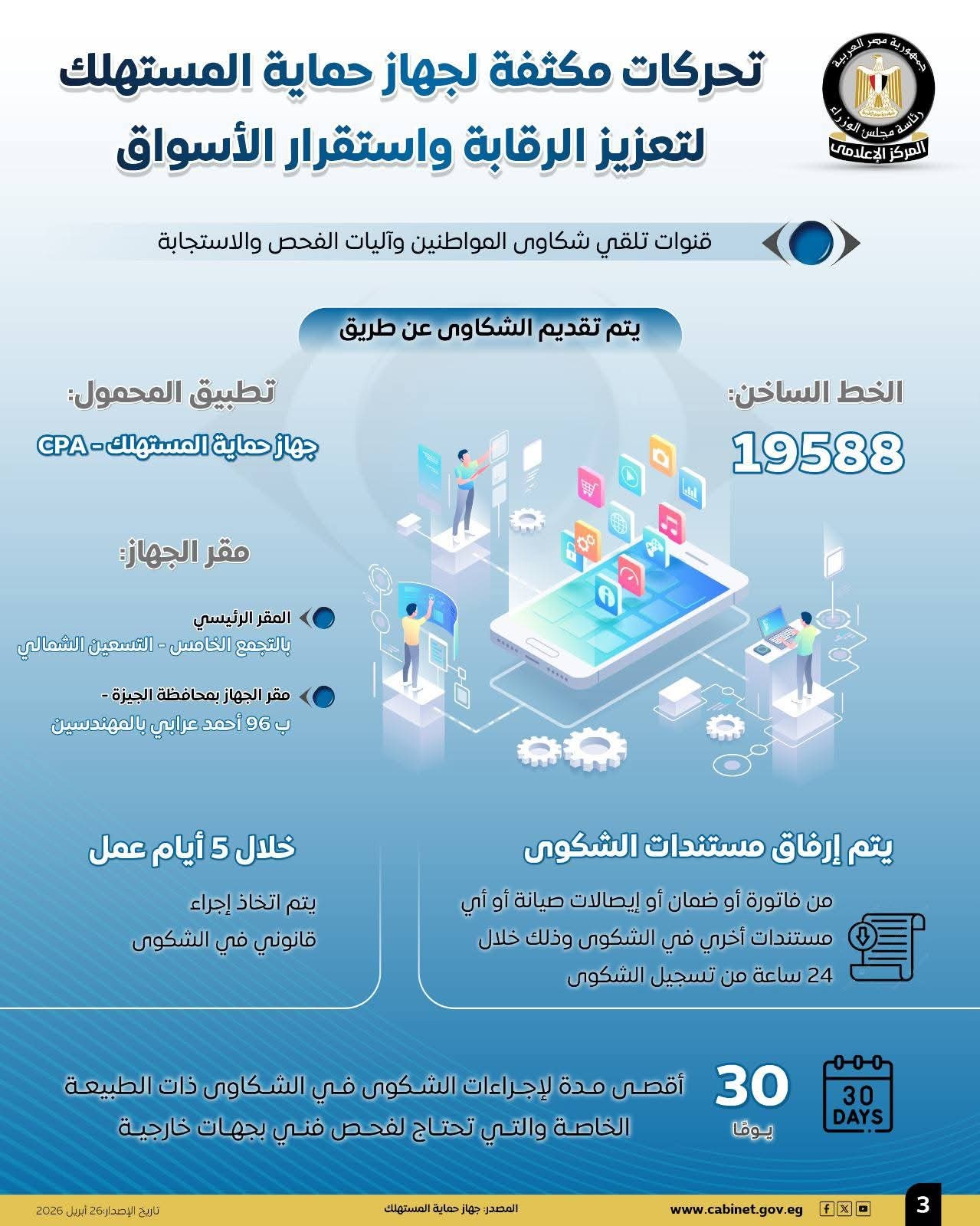 وأشارت الإنفوجرافات إلى قنوات تلقي شكاوى المواطنين وآليات الفحص والاستجابة، إذ يتم تقديم الشكاوى عبر الخط الساخن 19588، أو عبر تطبيق "جهاز حماية المستهلك – CPA" على الهاتف المحمول، أو من خلال المقر الرئيسي للجهاز بالتجمع الخامس – التسعين الشمالي، وكذلك مقره بمحافظة الجيزة في ب 96 شارع أحمد عرابي – المهندسين.