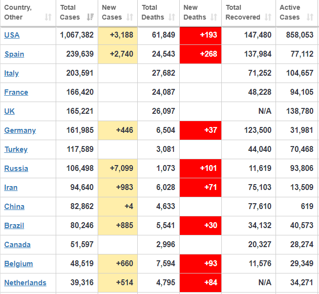 وسجل موقع "Worldmeters"، حتى اللحظة 230 ألف حالة وفاة في دول العالم، كان لأمريكا نصيب الأسد منه بـ 62 ألف حالة وفاة في ولاياتها.